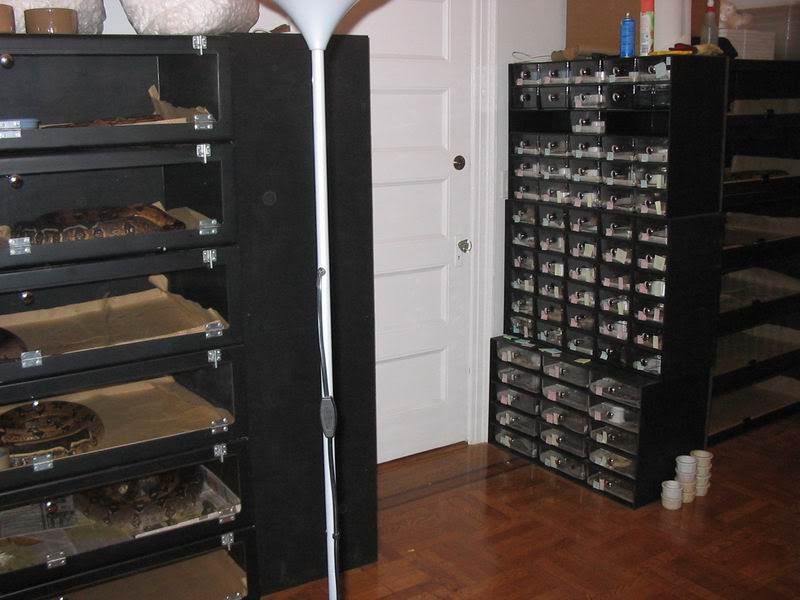 I also keep hatchlings in Boaphile Shoebox racks (the clear Phillips bins), and yearlings and young adults in Boaphile Sweaterbox racks (normal and the clear Phillips racks).