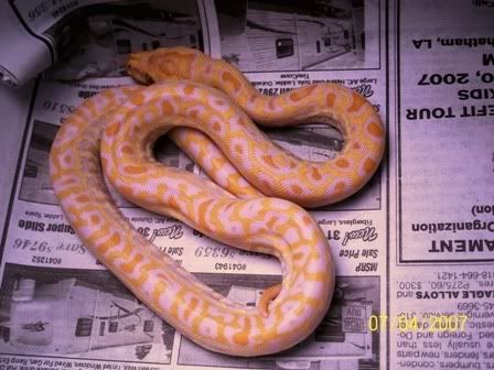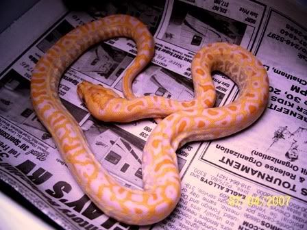 Posted by: HighEndHerpsInc at Wed Jul 4 23:34:27 2007 [ Email Message ] [ Show All Posts by HighEndHerpsInc ] Here are a couple of pics of a holdback albino cateater het granite. It's SO hard to capture the true colors but this little lady has tiny solid orange dots all over, surrounded by a deep, rich yellow with a very erratic pattern. Her sides have a deep lavender base color. |