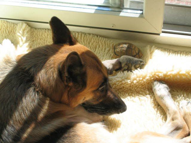 Posted by: DEJ at Mon Mar 31 21:37:49 2008 [ Email Message ] [ Show All Posts by DEJ ] Here's my guy, waking from a rest on a rug with his buddy, my partner. Funny as heck when the tort struts over and bites the pads on the paws of the sleeping German Shepherd. [ Hide Replies ]
