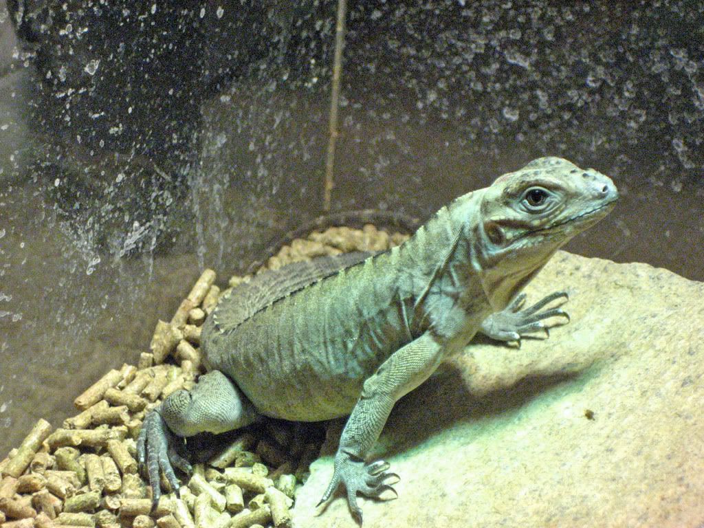 i finished a cage today that i converted from a retail display case. reinforced the sliding back doors and use the top glass to gain entry. i use a 60 watt ceramic heater (so i can have 24/hour heat on him and still go to sleep at night) and a 50 watt home depot halogen bulb. keeps the top of his basking area at about 140º surface temp. below his basking area he has little nooks with different temps for him to retreat to. and deep, burrowable substrate. i used "clean fill dirt" for landscaping as substrate. while i was digging it up, i created a large burrow-like hole to get the moist stuff on the inside and it held for 3 or 4 feet back as i kept shoving the shovel into it then i finally purposefully collapsed it.
