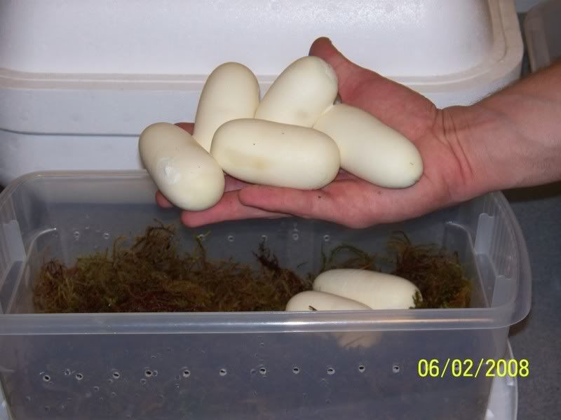 Posted by: derekdehaas at Sun Jun 1 23:03:14 2008 [ Email Message ] [ Show All Posts by derekdehaas ] got out of work and came home to this! nice clutch of 7 eggs and this is her first breeding this year. | ||