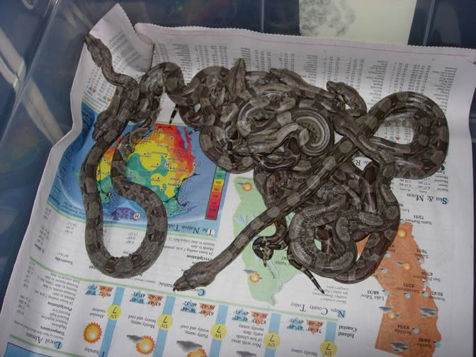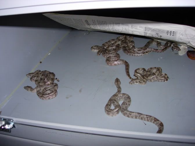 The rest are about what you would expect, sort of mixed up colors, some pink bellies and freckles on nice miniature pet boas. A couple of them are still going through their hissy phase, otherwise perfect little examples of hybrid vigor. High ratio of males, might only have one girl.