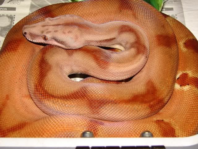 Even though she was just a freaky looking preemie, she would still be a cool looking animal if she survived and I could raise her up. If she made it. So I tried. Well, she absorbed all that yolk just like a perfectly healthy baby would. She shed just like all the other babies from that litter. In fact, instead of doing anything that I expected, she fed and has grown just like any normal Boa would. A fluke, or so I thought. Today she is a little over two years of age and 4 1/2' long. I hope maybe... maybe to breed her next year. But I am getting ahead of myself. Here she was at about six months of age: