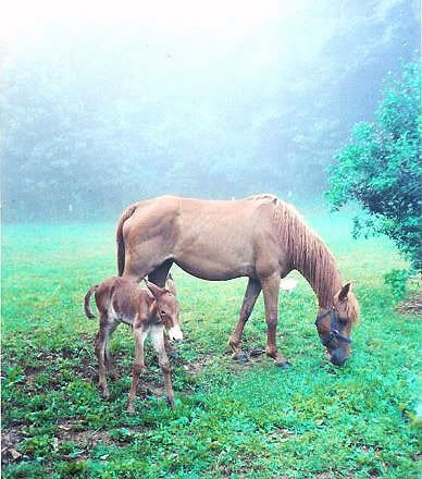 Here is Diamond, a Quarter Horse, with her newborn foal, Rosie, a mule. This photo was taken about 8 yrs ago.