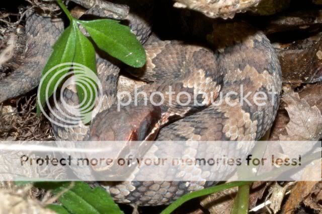 Ed Neltner's son Chris and friend Mike found a baby cottonmouth the first day, on the slope up to the bluffs on the dry side of the road. I haven't seen many of them, and i was shocked at how much it looked like a banded water snake. It was too easy to imagine me grabbing it if i hadn't seen the head or tail. It was also surprisingly small, under one foot. The second day i ran across this one coiled at the base of a tree on the wet side of the road, maybe two feet from the tire tracks.