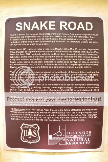 April 16 i met up with about a dozen folks from the Greater Cincinnati Herp Society (GCHS), at "Snake Road" in Southern Illinois. The road runs thru a very narrow swath between the bluffs in the background in the first photo below, and the swamps in the second photo. There's no more than 100 feet, i'd say, at the widest spot between the bluffs and the swamp, and the passage is often much narrower than that. The road is busy each spring and fall with herps moving from and to brumation sites, so the state closes off the road for two months each season. It's become well known to herpers--i met a couple fellows from indiana there, and there was a contingent from a kentucky herp society.