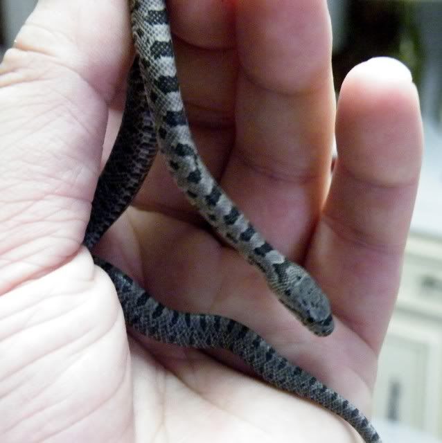 Posted by: mattkau at Wed Aug 25 10:26:47 2010 [ Email Message ] [ Show All Posts by mattkau ] I had a bit of a space issue for a few months back in the spring and housed about four or five of ratsnakes together for a little while in a very large cage. Well my female 08 everglades became gravid. I thought a male corn mated with her since he had been brumated, but there was also a male bairds in the cage as well. Now that six of the nine eggs have hatched I'm not so sure it was the corn snake. What do you guys think? I'm leaning toward everglades/bairdi cross. By the way neither the glades or the bairds were brumated and the female wasn't even two years old yet. Here are pics of the first one. I'll post more soon. [ Hide Replies ]