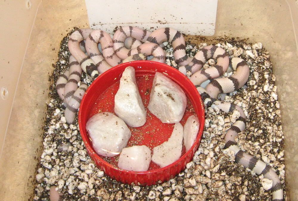 Since hypos and amels still involve red, orange and yellow pigment(erythrin and xanthin), and anerythristics(or maybe even more accurately termed extreme hypo-xanthics) do NOT display these pigments(or hardly anyway if indeed hypo-xanthic). All that is left to display is any pale remaining coloration when those colors are gone, which is a very light pinkish-gray in the RBR(red body rings) and pure white, or off-white, translucent pinkish color in their inner triad rings(rings of three).