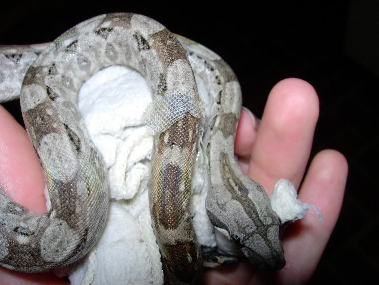Posted by: MountainLyon at Sun Feb 20 12:06:46 2005 [ Email Message ] [ Show All Posts by MountainLyon ] Bertha had her old skin stuck to her lower jaw, so the top hadn’t peeled very far either. Humidity is in the 70s, and I had made her take a couple baths first, even though she was being grumpy while the skin was stuck on her head. She skipped a meal before the shed, maybe that’s why she had problems shedding, from not growing right then. Bathing didn’t work, she had rocks in the cage to rub on but they didn’t work either. I wanted to hurry up and get this tiny little boa fed so it was time to help. I thought it was pretty cool how cooperative she was, obviously figured out that I was helping. [ Hide Replies ]