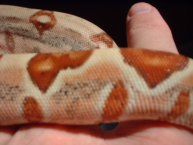 There are some Salmons that have sporadic speckles, and then there are some that have a conglomeration of dark speckles that actually form a line or band that streams down the sides of the Salmon or hypo. It is my opinion that this is some sort of color band that seems to dispearse the color through the animal as they grow. I had some animals that had smaller bands and they are gone completely and some that still show that band through the side and color keeps building in the animal. Maybe some others with more knowledge of this can comment, but this is what I am witnessing. Thanks again, Andy Federico