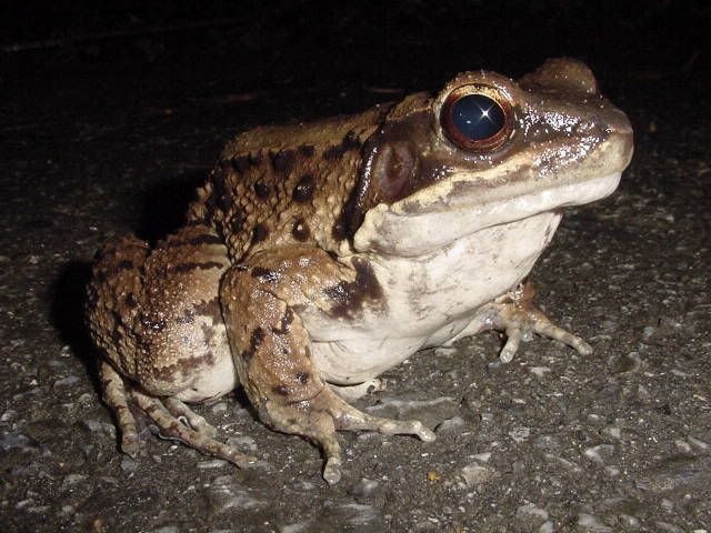 Japanese Toad (Bufo j. japonicus). Apparently, this species has suffered some considerable, local population declines due to scientific collection (=the frog most students see). They have an interesting defense strategy. Instead of inflating their bodies, they raise up, with legs nearly vertical, and flatten their vertical profile. It was fun to watch, but very frustrating to photograph. This was the best I could do, as their other defensive strategy is movement: