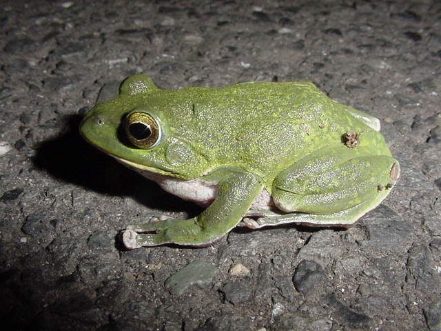 Rhacophorus schlegellii It plopped from a tree right onto the road. That was at least an 8’ drop; must’ve been uncomfortable for the frog, as it didn’t move for the photo session. These frogs were also a common sight: