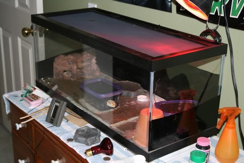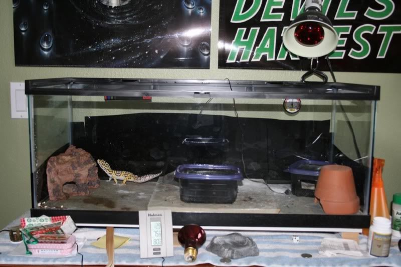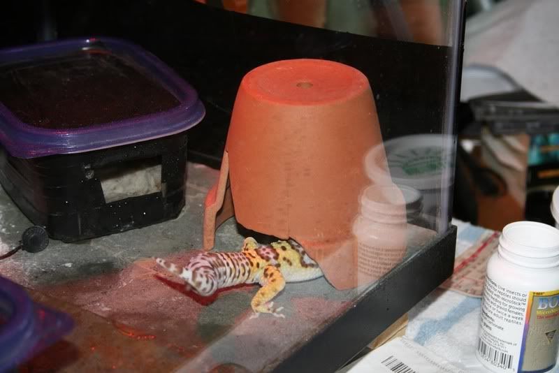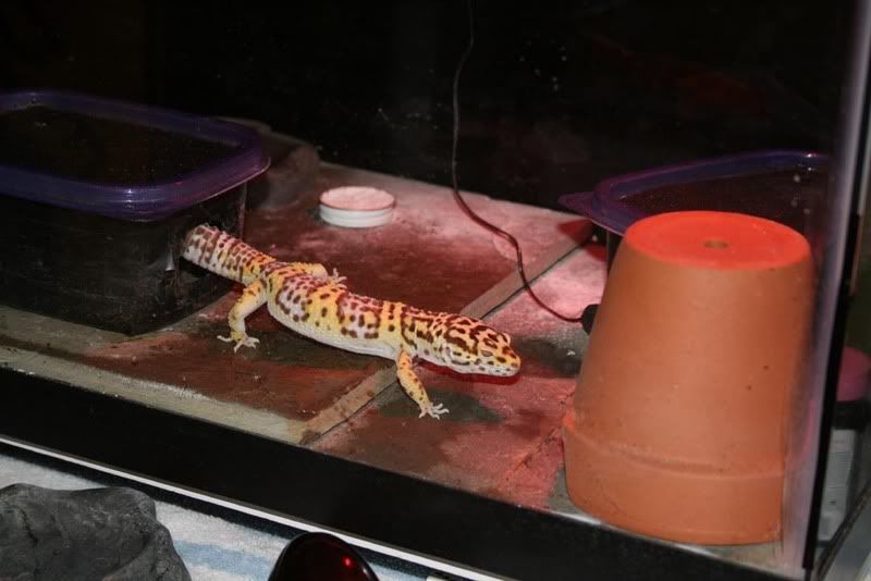 Posted by: AndrewFromSoCal at Fri Apr 13 16:57:51 2007 [ Email Message ] [ Show All Posts by AndrewFromSoCal ] I don't remember who asked for pictures of my gecko and his habitat, but here you go. I took some snap shots today while cleaning my room. The flash on the pictures really doesn't do him justice, he's more of a highlighter color. I believe he was a month old when I got him, so that makes him about 9 months old now. His bands have blotches of yellow in them, so maybe they'll dissapear completely by the time he is full grown. Irregardless, he's an awesome gecko. I got these today after I vacuumed my room and sprayed down his cage (he likes to lick the condensating moisture, even though he has a constantly full water bowl, so I spray once a week) and he did a few gecko laps around his territory. [ Hide Replies ]