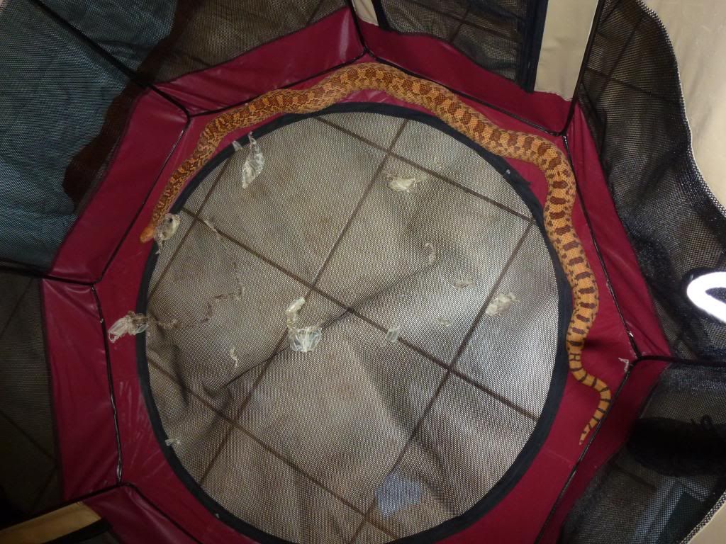Posted by: Pit_fan at Fri Nov 23 09:24:54 2012 [ Email Message ] [ Show All Posts by Pit_fan ] Slightly off topic here but WOW, that Rozy is really putting on some heft. I finally purchased a puppy playpen for Ahnuld and my other large adults. Gives them a large secure enclosure to cruise around in. This is a photo of Ahnuld (really big male Kingsville Red) having just shed in the playpen. Ahnuld is way beyond casting in one piece due to his size and mass (he's over 10 lbs. now and right at seven feet long). Anyrate, these playpens are 57" wide and three feet tall. This one is flipped over on its top using the mesh ceiling as a floor. One of THE best purchases for my large Pituophis since frozen rodents... | ||